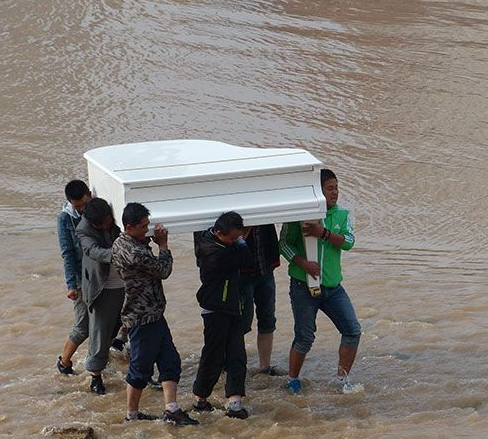 在不斷上漲的水勢下,組織方緊急和搬運部門取得聯系,想租用長臂吊車來將鋼琴吊出孤島,但是費用可實在不菲。情急之下,在嘩嘩的流水聲中,筆者向遠在寧波的陳董事長請示。聞聽此事后,陳董在電話里只說了八個字:沒有問題,注意安全!在場的工作人員聽到這句話,都稱贊和感謝陳董對活動的支持和理解??墒菚r間不等人啊,長臂吊車遠水只怕難解近渴。搬琴的師傅們也在積極地琢磨其他辦法,經過勘察,他們終于找到一處水不太深的地方。幾位師傅找到承力點,大吼一聲,奮力抬起鋼琴,在急流中踩著水中碎石,一鼓作氣將鋼琴抬到了安全地帶。在不經意間,這些可敬可愛的師傅們創造了在黃河水中搬運鋼琴的奇跡!